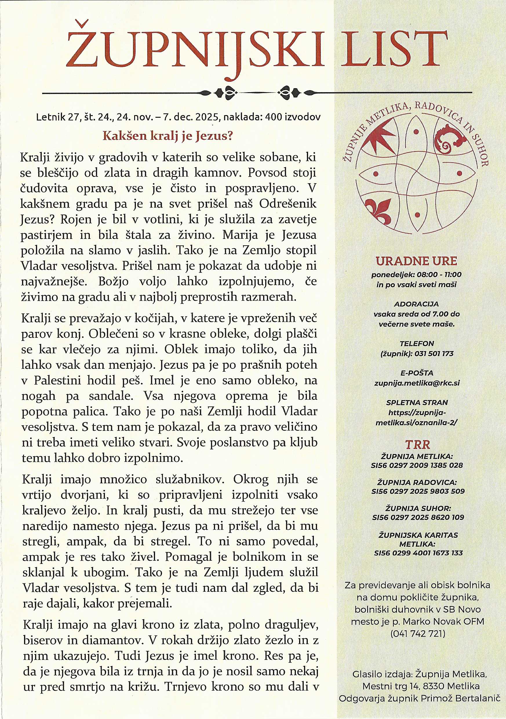Spletna stran župnij Metlika, Suhor in Radovica »Razveselite se tisti dan in poskočite od sreče, kajti vaše plačilo v nebesih je veliko.« (Lk 6,23a) DOMOV O ŽUPNIJI Kontakt Dogodki Cerkve BOGOSLUŽJE Maše Zakramenti Otroški pevski zbor OZNANJEVANJE Verouk Vprašanja za birmo Slomškovo bralno priznanje DOBRODELNOST Karitas Anin sklad Pomembni datumi v tem letu Božja beseda Dogodki Zahvalna nedelja nedelja, 9. novembra 2025METLIKASUHOR Molitev rožnega venca iz Metlike do Treh far nedelja, 19. oktobra 2025 « Older Entries A VSI DOGODKI