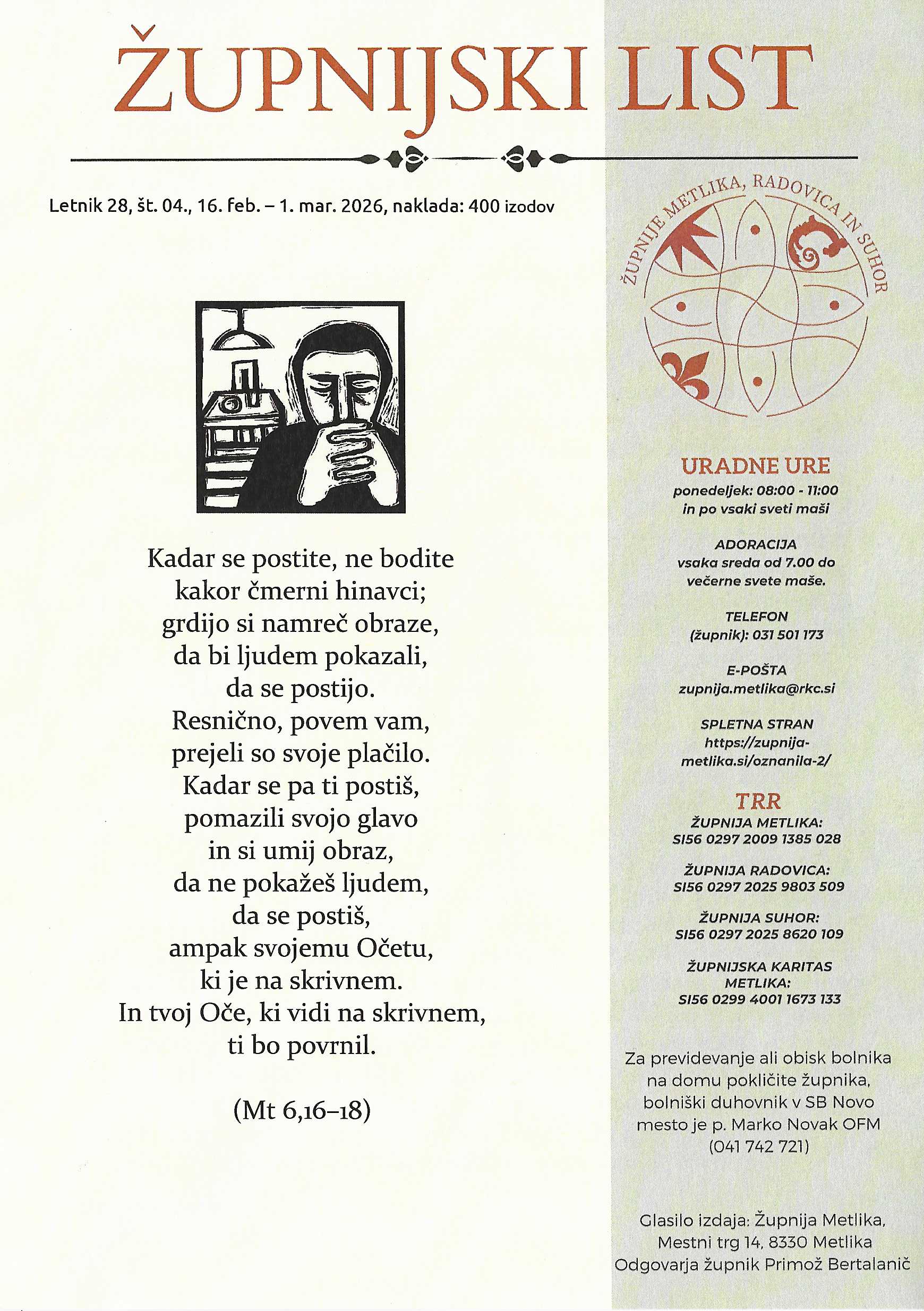 Spletna stran župnij Metlika, Suhor in Radovica »Razveselite se tisti dan in poskočite od sreče, kajti vaše plačilo v nebesih je veliko.« (Lk 6,23a) DOMOV O ŽUPNIJI Kontakt Dogodki Cerkve BOGOSLUŽJE Maše Zakramenti Otroški pevski zbor OZNANJEVANJE Verouk Vprašanja za birmo Slomškovo bralno priznanje DOBRODELNOST Karitas Anin sklad Pomembni datumi v tem letu Božja beseda Dogodki Prvi petek petek, 6. februarja 2026 Sv. maša ob 175. letnici Mestne godbe Metlika nedelja, 25. januarja 2026 « Older Entries A VSI DOGODKI