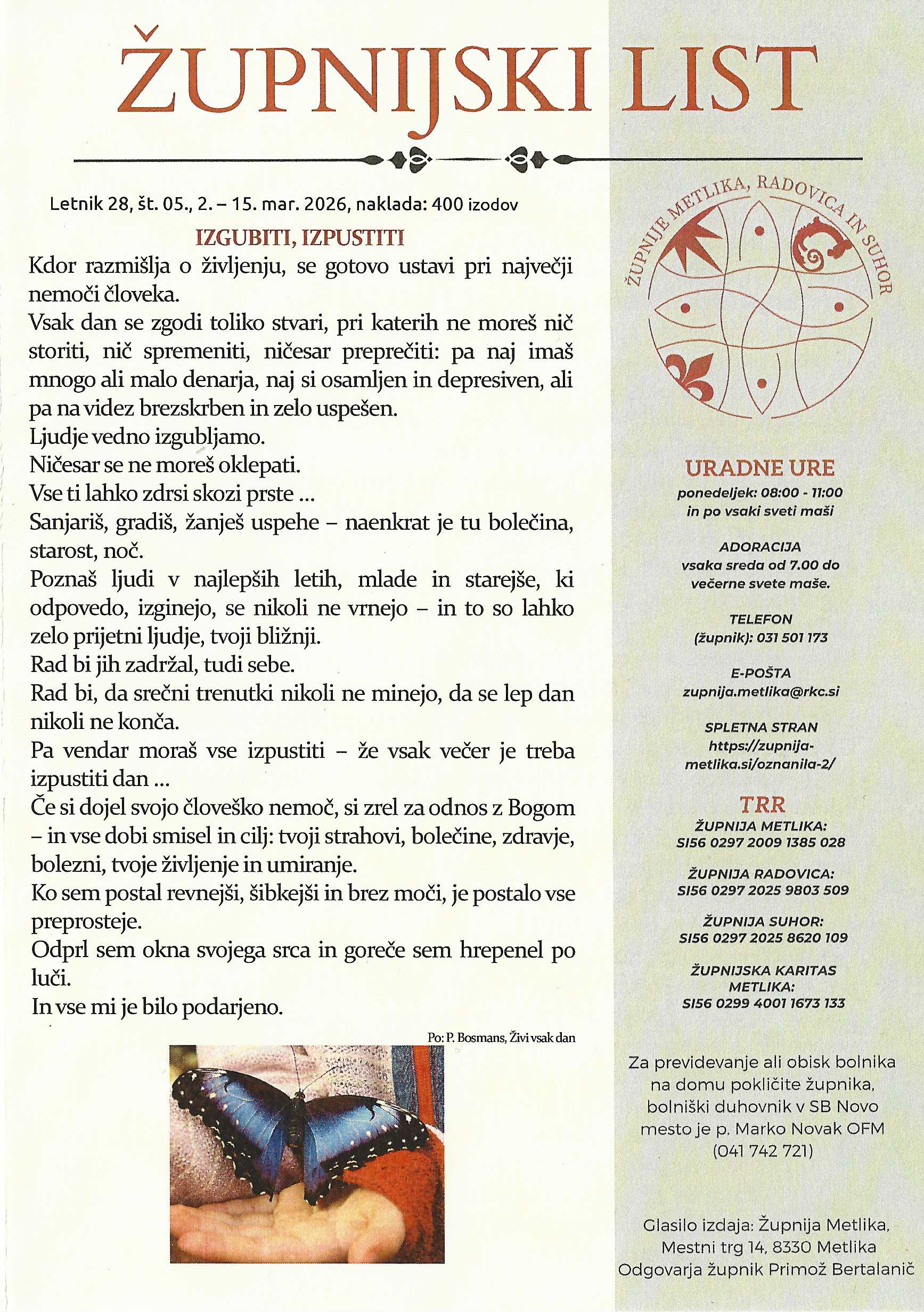 Spletna stran župnij Metlika, Suhor in Radovica »Razveselite se tisti dan in poskočite od sreče, kajti vaše plačilo v nebesih je veliko.« (Lk 6,23a) DOMOV O ŽUPNIJI Kontakt Dogodki Cerkve BOGOSLUŽJE Maše Zakramenti Otroški pevski zbor OZNANJEVANJE Verouk Vprašanja za birmo Slomškovo bralno priznanje DOBRODELNOST Karitas Anin sklad Pomembni datumi v tem letu Božja beseda Dogodki Križev pot petek, 27. februarja 2026 Prvi petek petek, 6. februarja 2026 « Older Entries A VSI DOGODKI