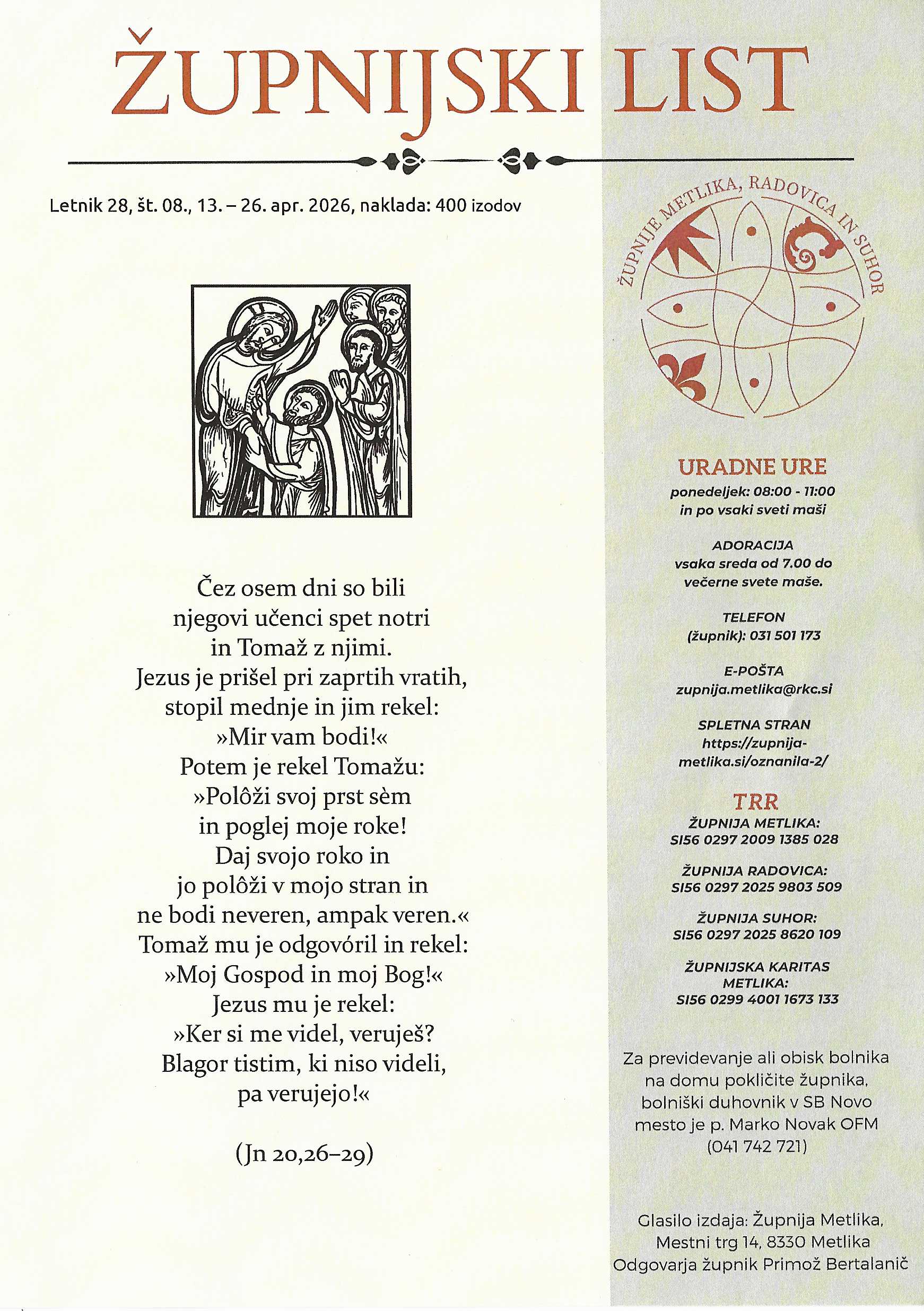 Spletna stran župnij Metlika, Suhor in Radovica »Razveselite se tisti dan in poskočite od sreče, kajti vaše plačilo v nebesih je veliko.« (Lk 6,23a) DOMOV O ŽUPNIJI Kontakt Dogodki Cerkve BOGOSLUŽJE Maše Zakramenti Otroški pevski zbor OZNANJEVANJE Verouk Vprašanja za birmo Slomškovo bralno priznanje DOBRODELNOST Karitas Anin sklad Pomembni datumi v tem letu Božja beseda Dogodki VELIKA NOČ nedelja, 5. aprila 2026 Velikonočna vigilija sobota, 4. aprila 2026 Blagoslov ognja sobota, 4. aprila 2026 Veliki petek petek, 3. aprila 2026 « Older Entries A VSI DOGODKI
